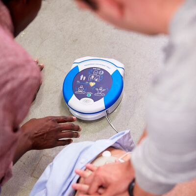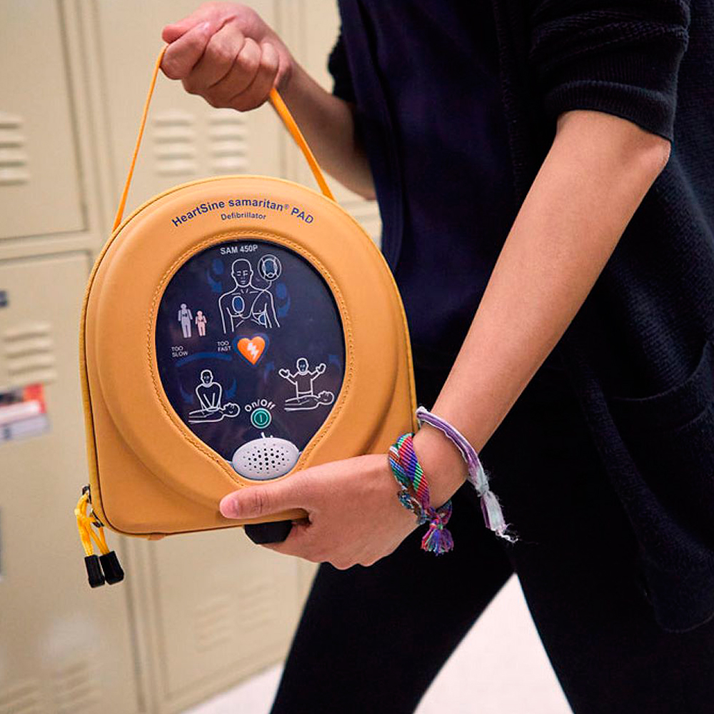 Устройство для оказания первой медицинской помощи в общественных местах. Прибор способен анализировать сердечный ритм пациента, но для подачи разряда требуется нажать на соответствующую кнопку для восстановления нормальной работы сердца.