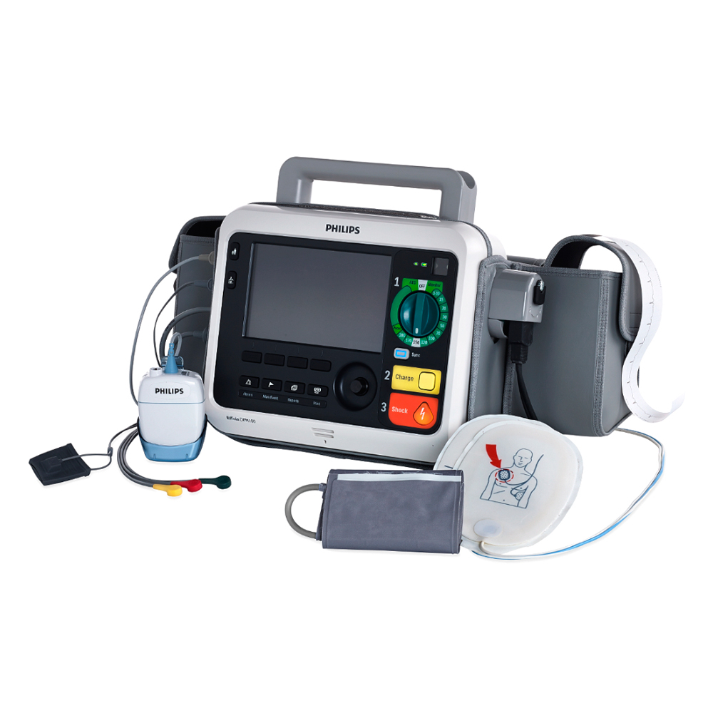 Устройство для оказания экстренной помощи при остановке сердца. Дефибриллятор Philips Efficia DFM100 помогает медицинским работникам выполнять дефибрилляцию, мониторить ЭКГ, отслеживать артериальное давление, ЧСС, уровень насыщения крови кислородом.