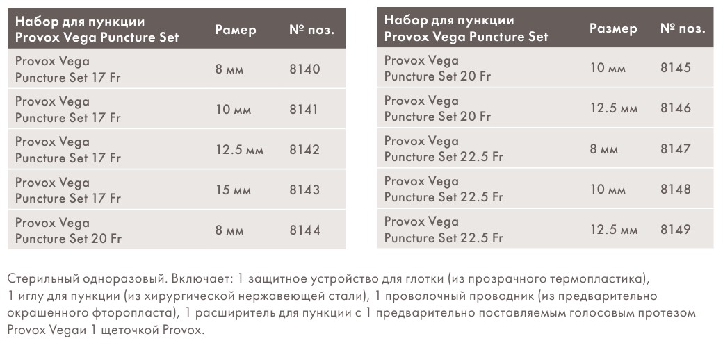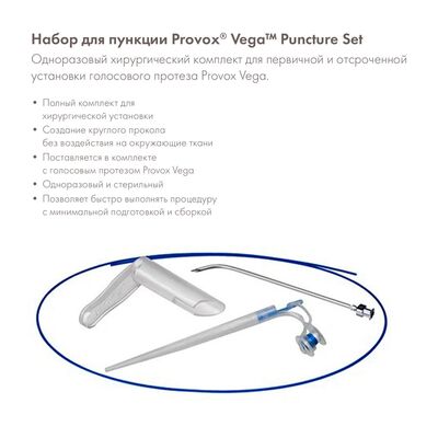 Пункционный набор Provox Vega Puncture Set представляет собой одноразовый хирургический комплект для выполнения первичного (одномоментно в процессе ларингэктомии) или отсроченного трахеопищеводного шунтирования с последующим расширением пункционного канала до ширины, которая обеспечивает возможность установки включенного в состав набора голосового протеза Provox Vega.
